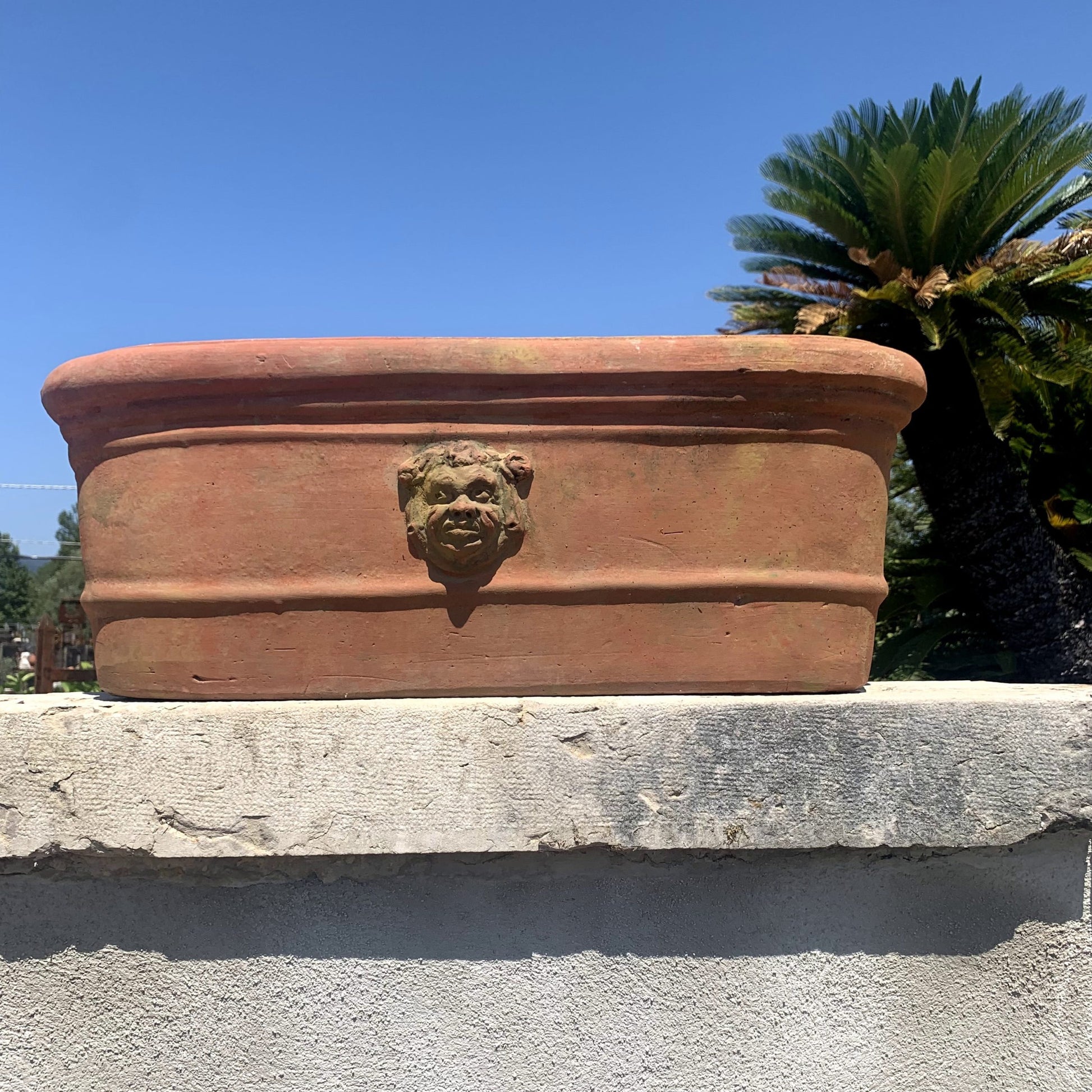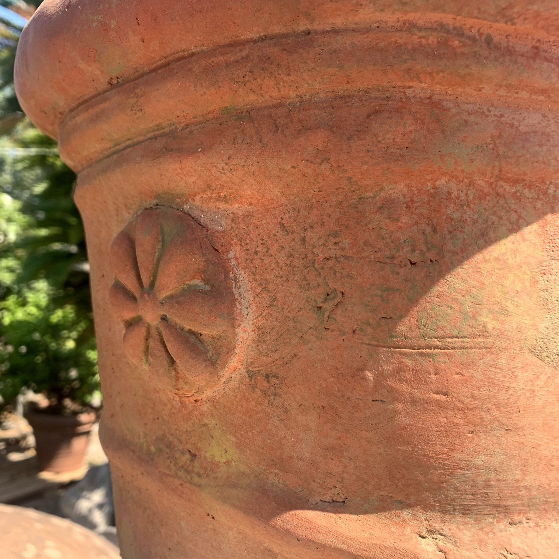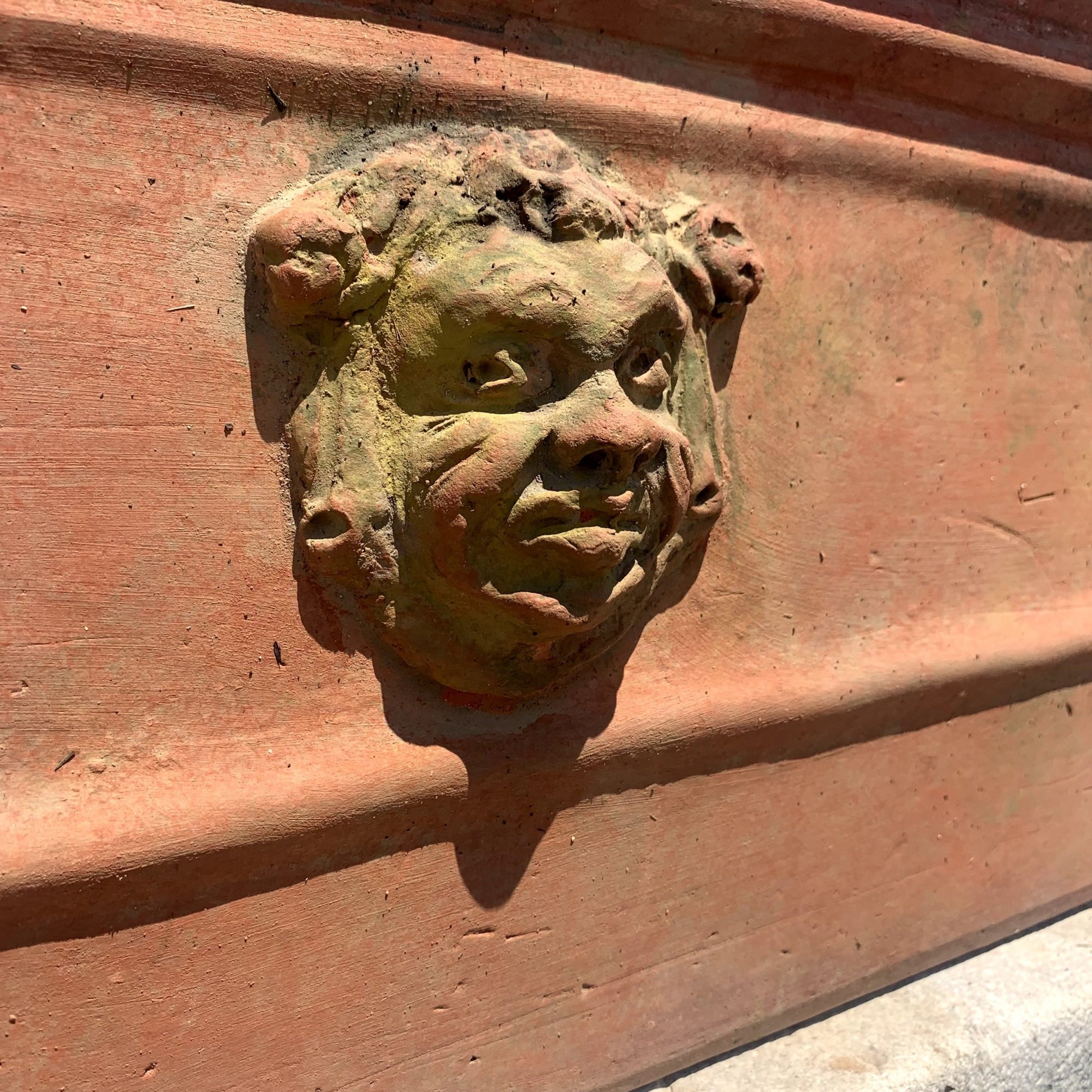 Terracotta vase decorated with a central mask and small flowers on the sides.